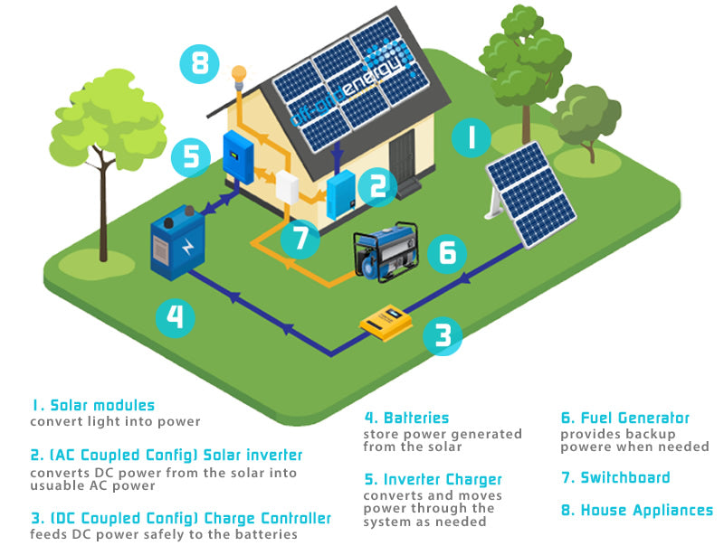Following the diagram gives an excellent overall understanding of the flow of energy from when its captured by the sun and how it ties into an off-grid solar system. Please remember that it is always good to have a fuel backup generator, whether fuel, diesel or propane.